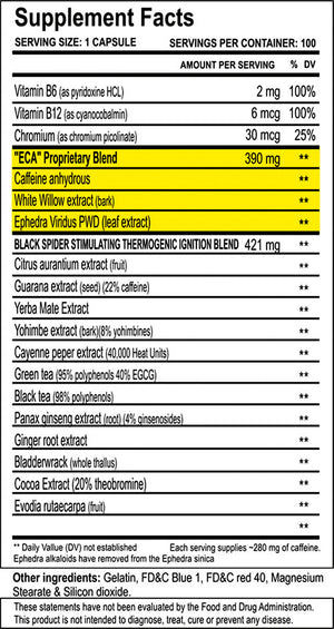 Trapped within the "web" of each capsule is an ECA blend of Ephedra, caffeine USP and White Willow, along with what we consider to be some of the world's most intensely invigorating thermogenic and lipolytic catalysts including Citrus Aurantium and Yohimbe.*