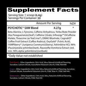 WANNA PLAY A GAME? Psychotic SAW is the most INSANE preworkout ever made by the Mad Chemist and his team at Insane Labz. They've packed the formula FULL of ingredients that work together to give you everything you need to KILL it in the gym! Below, expand each of these ingredients to learn what makes Psychotic SAW different than any preworkout you've ever tried!