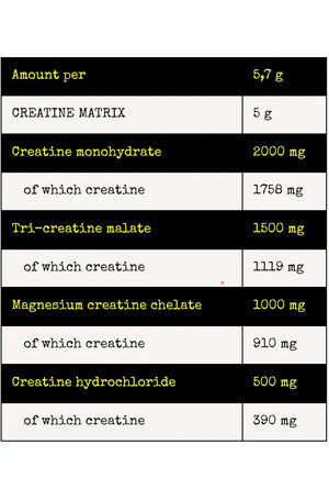 Ingredients: Creatine matrix (creatine monohydrate, tri-creatine malate, magnesium creatine chelate, creatine hydrochloride), acidity regulator (citric acid), red beet juice concentrate2,3, flavourings1,2,3,4,5,6,7,8,9,10, flavouring11, salt10, anti-caking agent (E551), red beet juice concentrate5,6,7,8,9, black carrot concentrate3,10,11, sweeteners (sucralose, acesulfame K), colour [(E160a)1,2,4,5,8, (E132)9].