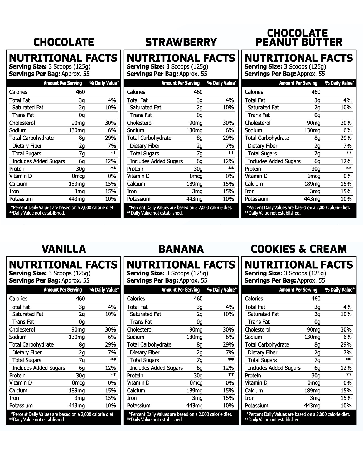 Maltodextrin, Protein Blend (Whey Protein Concentrate, Whey Protein Isolate, Micellar Casein), Cocoa Powder, Taurine, HMB, Creatine Monohydrate, L-Arginine, L-Ornithine, Fenugreek, Fructose, Natural & Artificial Food Flavors, Silicon Dioxide, Glutamine, Soy Lecithin, Thickener, Xanthan Gum, Sweetener: Mixture of Sucralose & Acesulfame Potassium.